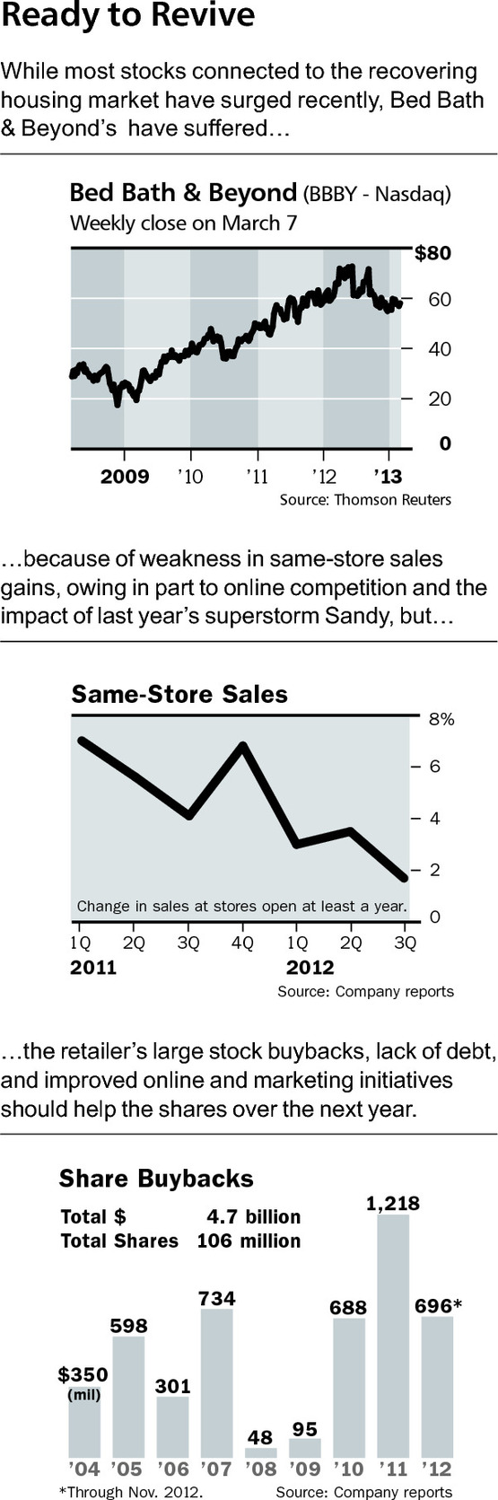 Bed Bath & Beyond has fallen from favor on Wall Street because of slowing comparable-store sales gains, mild profit disappointments, and concern that its weak Website makes it vulnerable toAmazon.com (AMZN) and other top Internet retailers. The company’s shares have slid 6% in the past year, even as virtually all stocks connected to the improving housing sector have surged.