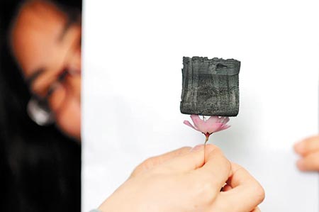 The aerogel produced by Chinese scientists is so light that it can be placed on a flower. (Photo/Xinhua)