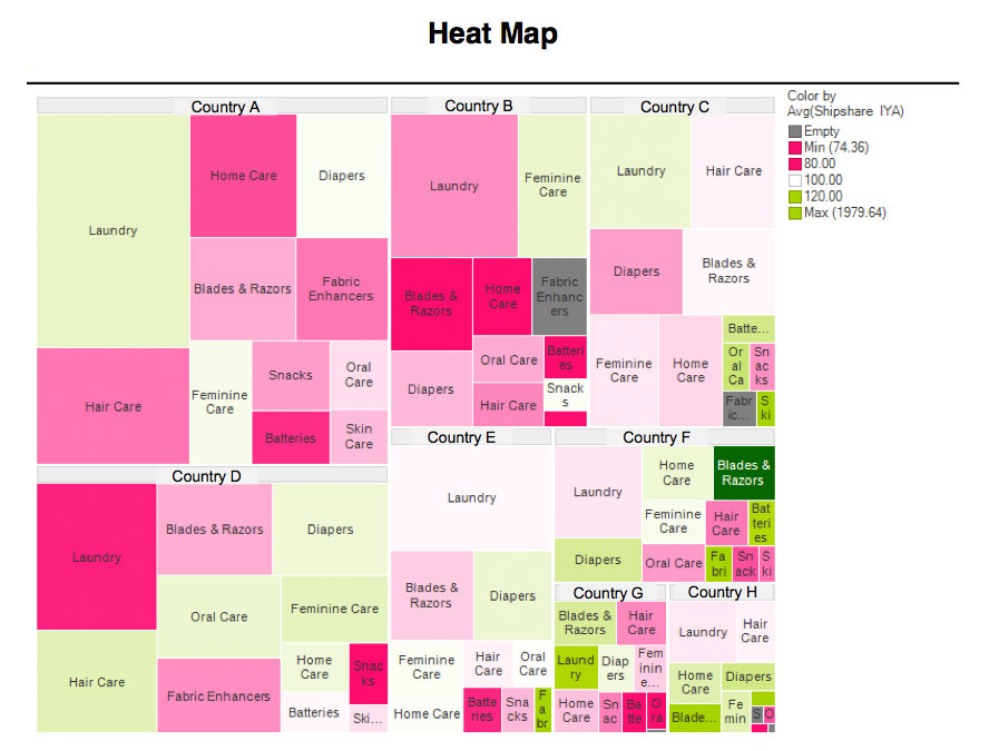 Take the heatmap shown here (click to see a larger version), for example, which is a typical one for P&G in Europe. Simultaneously it shows all the markets in which P&G products compete and their relative share (red indicating low market share and green indicating high market share), and also puts in clear perspective the importance of growing the share of any one of those markets. Guy Peri, an IT Director at P&G who until recently was in charge of business analytics, explained why that perspective is useful: