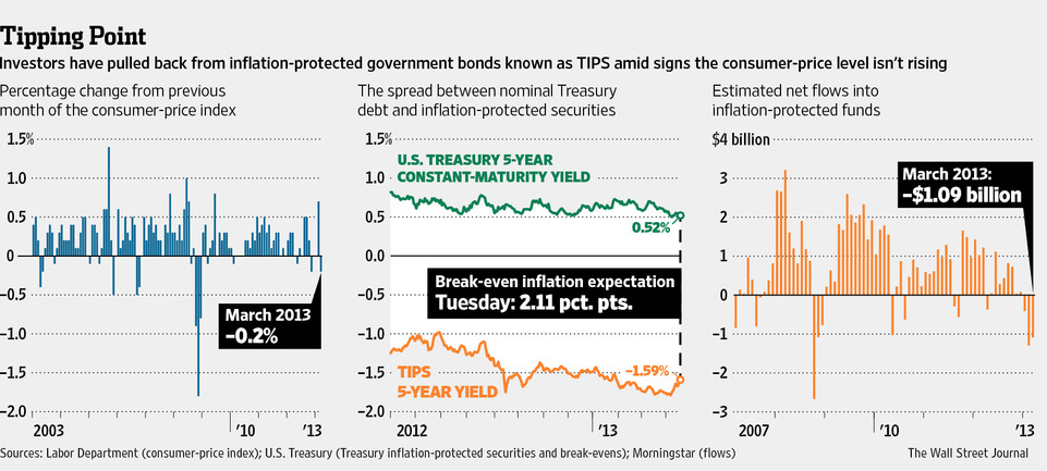 Bond investors have been pouring into the $883 billion market for Treasury inflation-protected securities, or TIPS, over the past year, in a bid to protect their purchasing power in case of rising prices. TIPS holders receive adjustments to the principal value of their bonds tied to the rate of inflation, protecting their holdings from being eroded by rising price levels.But on Tuesday, the Labor Department reported that March’s consumer-price index fell 0.2% on a seasonally adjusted basis, compared with a flat reading the market had expected. The main contributor was a 4.4% drop in gasoline prices.