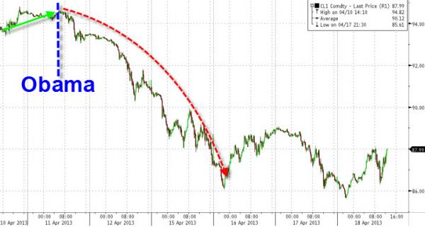Correlation is not causation; but coincidence means you’re on the right path. Looking at the charts of Stocks, Commodities, and Precious Metals, we wonder just what it was that President Obama said at his 11am ET White House meeting last Thursday… Equity markets soared out of the gate on the 11th. Jobless claims beat expectations handily (shaking off the previous week’s concerns) and all was well in the world… until just after 11am ET (when the CEOs of Wall Street’s big banks – for no apparent reason – met with President Obama)… and this happened… Gold also peaked at just after 11am ET… as did Crude oil… So what did Obama tell them?
