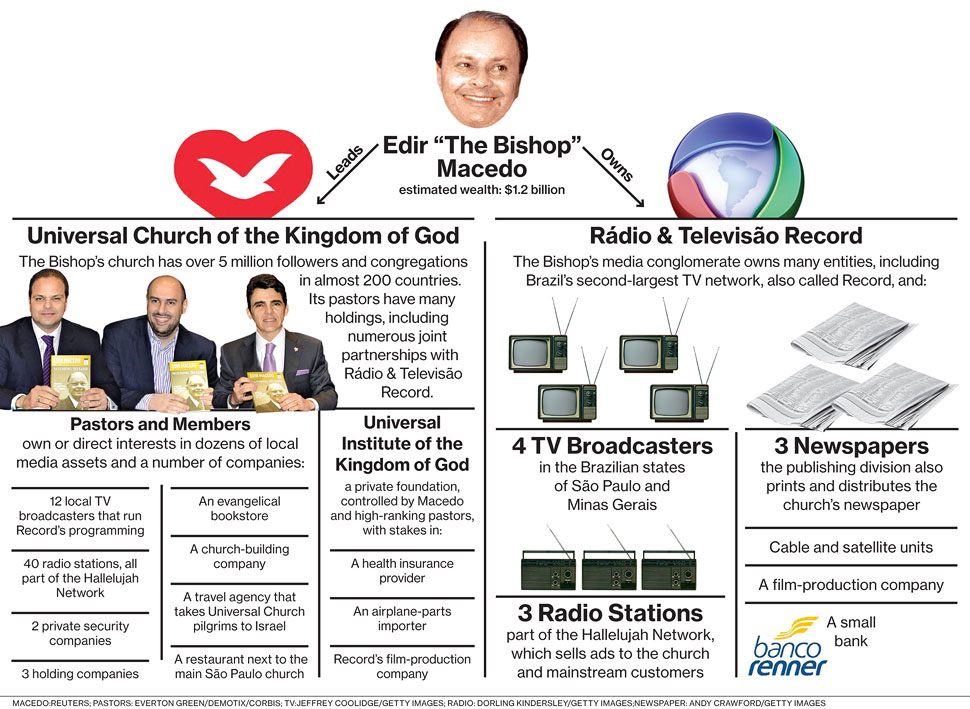 Whatever the semantics, he has prospered. The Bloomberg Billionaires Index estimates his wealth at $1.2 billion, entirely because of his ownership of Rádio & Televisão Record. The conglomerate’s namesake TV network produces standard commercial fare: telenovelas (sometimes Biblical), sex-infused reality shows, and journalism that dwells on grisly crimes. Record also runs a cable news channel, a handful of radio stations, three newspapers, a film-production company, and even a small bank, as well as cable and satellite units scattered around the world.