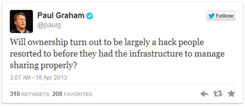That’s just one example. More generally, I think it’s hard to deny that both industries (AWS, Foxconn, etc) and individuals (from AirBNB to Zipcar) are increasingly moving towards collective usage of large pools of widely accessible shared resources. Economies of scale as a service, as Aaron put it. So far the effects are limited to specific sectors and domains — but it’s only a matter of time before this wave of change reaches, and profoundly disturbs, entire industries hitherto untouched by its force.