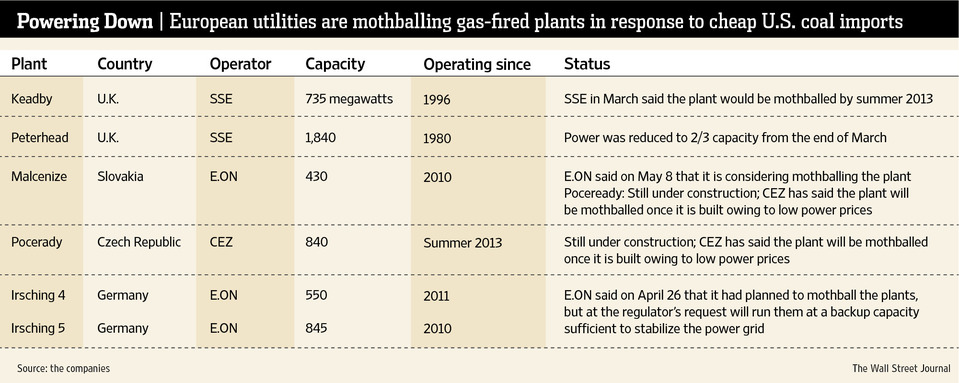 Shale Boom a Bust for Europe’s Gas Plants; European utilities are forced to mothball modern gas-fired power plants that can’t compete with growing imports of cheap coal dislodged from the U.S.