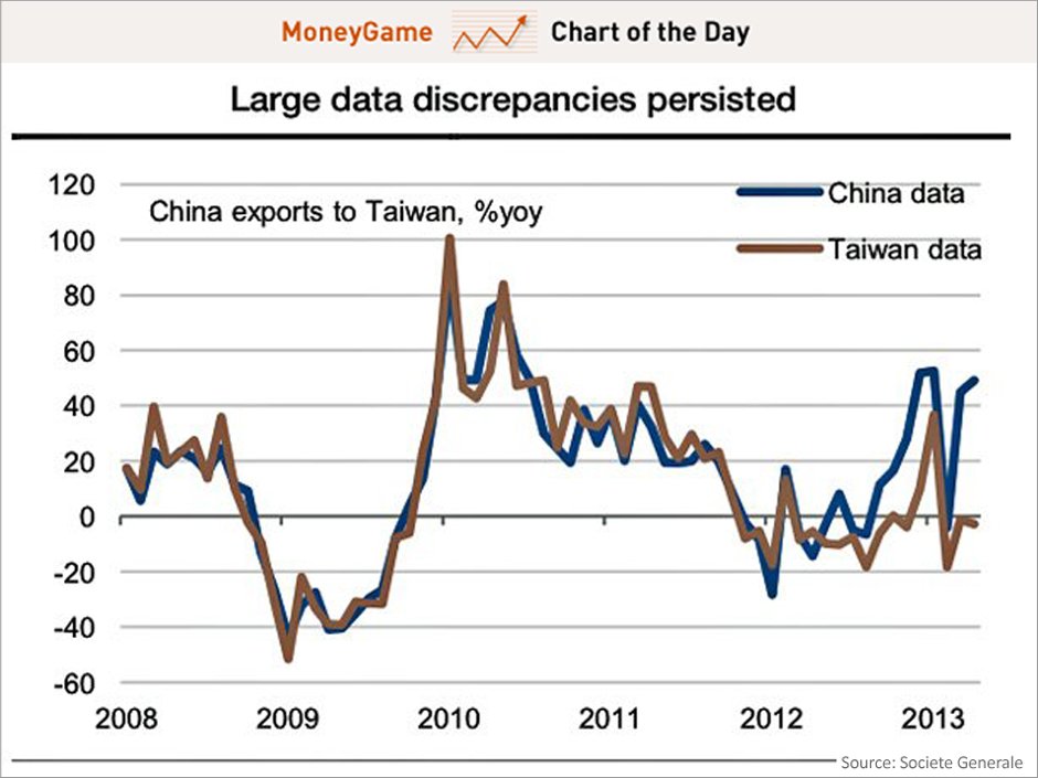 Earlier today, China published its official April trade figures. And while the numbers for both imports and exports were much stronger than expected, experts have been left scratching their heads over the unusual discrepancies. For one thing, exports surged 14.7% year-over-year even as exports to the U.S. fell by 0.7%. Exports to the EU fell by 6.4%. In a note to clients, Nomura’s Zhiwei Zhang attributed it to companies trying to get around strict Chinese capital controls. “We believe exports to destinations like Hong Kong, a major financial hub, are likely being over-invoiced in an attempt to circumvent capital controls and bring foreign capital into China,” said Zhang who pointed out that exports to Hong Kong surged by 57.2%. Societe Generale’s Wei Yao agrees with Zhang. “As for reasons, our observation from the trips to the mainland led us to believe that there is indeed a large amount of speculative capital flows,” wrote Yao in a note to clients. “Nearly all corporates we met admitted that they were conducting some forms of interest rate arbitrage on the expectation of further yuan appreciation.” But Hong Kong wasn’t the only discrepancy. Yao noted a whopper in the Taiwan numbers. “Head-scratching discrepancies in bilateral data comparison persisted on both sides of the ledger,” she wrote. “Compared with the data from Taiwan – the only economy besides China that has published the complete set of April data – growth of mainland exports to Taiwan was 57.7 ppt faster based on China’s data (+49.2% yoy vs. -2.7% yoy) and that of mainland’s imports from Taiwan was 58.6ppt faster (+55.7% yoy vs. -2.9% yoy)! The gaps narrowed only marginally from March.” No wonder people question the reliability of the data.