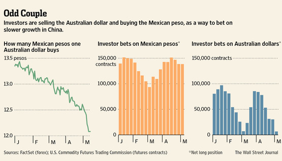 Investors bracing for slower growth in China are turning to a formerly little-used currency trade: selling Australian dollars and buying Mexican pesos. The bet is that Australia’s economy, and its currency, will suffer as Chinese demand cools for raw materials like iron and coal. Mexico, with closer ties to the resurgent U.S. economy, is seen as more insulated if commodities prices fall.It is a pairing born out of a lack of alternatives: With interest rates near zero in most developed countries, heavily traded currencies like the dollar, euro and yen offer little or no returns. Profits are being squeezed on more traditional wagers amid a stampede into higher-yielding and riskier assets. Investors are getting more creative about what they buy and sell. In the case of the Aussie and peso, that means embracing the extra risk that comes from trading two traditionally volatile currencies against each other.