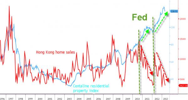When the Fed extended its guidance for extremely low rates to 2014 and later, none of the Chinese government’s measures to deter property speculation could deter ‘homebuyers’ from bidding up prices. However, as the chart below shows, the disconnect between home prices (extreme highs) and home sales (near lows) has never been greater and with the Chinese looking to further control speculation at the same time as a Fed that is increasingly jawboning a slowing to its easy money policy, the prices of Hong Kong property has begun to drop in recent weeks. As Bloomberg notes, prices have fallen 4.2% from a record reached in mid-March, compared with a 77% contraction in sales from their post-global financial crisis peak in 2010. The prices of property is explicitly deterring the ‘urban dream’ that we explained here, but any sustained drop in property prices (given the shadow lending and collateralization this bubble represents) leaves China once again between a bubble-pricking rock and an inflationary (social unrest harboring) hard place. The Hong Kong dollar’s peg to the U.S. counterpart has kept borrowing costs in the city at near-record lows, underpinning a 109% gain in home prices since the beginning of 2009, even as the government imposed several property curbs to cool demand. Hong Kong property prices relative to sales…