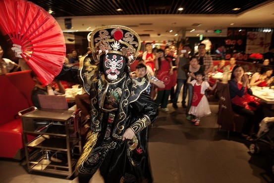 If P.T. Barnum had ever opened a restaurant, it might look a lot like Hai Di Lao, the popular chain of 75 Chinese eateries planning its first foray into the U.S. market this fall. Talk about a three-ring circus: Diners pass the time in the waiting area with Internet terminals, board games and kids’ toys. They can nibble on unlimited free snacks. Or kick back for a shoeshine, manicure or hand massage. In the dining room, patrons wearing full-size aprons provided by the restaurant lean together over the boiling caldrons embedded in each table, dropping morsels of uncooked meat, fish, vegetables or tofu in a spicy steaming broth, then dipping them in flavorful sauces. On special holidays, magicians in colorful, traditional masks perform tricks. Patrons order using iPads. Periodically, a server breaks into the restaurant’s signature Olympic-style “noodle dance.”