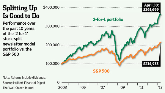 The price of Noble Energy NBL -1.15% shares will be cut in half this coming Wednesday, when the oil-and-gas-exploration company’s previously announced 2-for-1 split goes into effect. This will follow close on the heels of two other companies whose stocks this past week also fell because of 2-for-1 splits: consumer-products company Colgate-Palmolive CL +0.33% and A.O. Smith, AOS -0.10% a water-heater manufacturer. In fact, so far this year 25 NYSE or Nasdaq National Market companies have split their shares by 2 for 1 or more, according to data provider Mergent. The number of such companies has been rising steadily along with the bull market; for all of 2009, for example, there were just 12 such splits. Should you change your opinion of Noble Energy, or any of these other companies, just because they split their shares? It is difficult to see why you should. A 2-for-1 split, for example, merely means you now own twice as many shares that are worth half as much. But try telling that to Neil Macneale, editor of an investment-advisory service called “2 for 1,” whose model portfolio contains only those stocks that have recently split their shares, holding them for 30 months. Over the past decade, according to the Hulbert Financial Digest, that portfolio has produced a 14% annualized return, far outpacing the 8% gain of the Standard & Poor’s 500-stock index, including dividends.Mr. Macneale’s track record isn’t a fluke. Several studies have found that the average stock undergoing a split outperforms the overall market by a significant margin over the three years following the company’s announcement of that split. Indeed, Mr. Macneale said in an interview, he got the idea for his advisory service in the 1990s from one of the first such studies, conducted by David Ikenberry, now dean of the Leeds School of Business at the University of Colorado, Boulder.