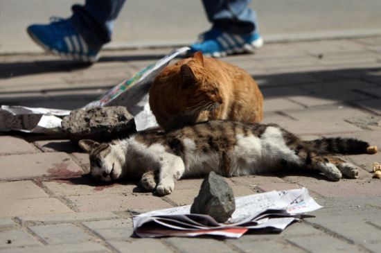 A pregnant cat was fatally struck by a vehicle and died on the side of a road in Changchun city, NE China’s Jilin province on May 23rd. A brown cat refused to leave the side of his companion for at least 7 hours and wouldn’t let any one, not even a dog, come close to the scene of tragedy.