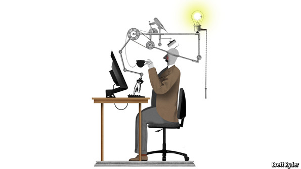 IN HIS first novel, “Player Piano” (1952), Kurt Vonnegut foresaw that industry might one day resemble a “stupendous Rube Goldberg machine” (or as Brits would say, a Heath Robinson contraption). His story describes a dystopia in which machines have taken over brain work as well as manual work, and a giant computer, EPICAC XIV, makes all the decisions. A few managers and engineers are still employed to tend their new masters. But most people live in homesteads where they spend their time doing make-work jobs, watching television and “breeding like rabbits”.
