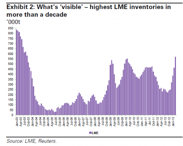 No two charts express this better than the following. First from Goldman, trends in LME inventory levels since 2003: