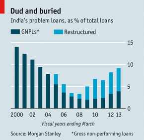 The proportion of the present stock of restructured loans that has deteriorated to become non-performing has risen, to 25% in the case of State Bank of India, the biggest government-run lender. That disproves they are safe. And total problem loans, either non-performing or restructured, have reached 9% of the total, according to Morgan Stanley (see chart). That is alarmingly near the level of a decade ago, when Indian banks were in the doghouse.