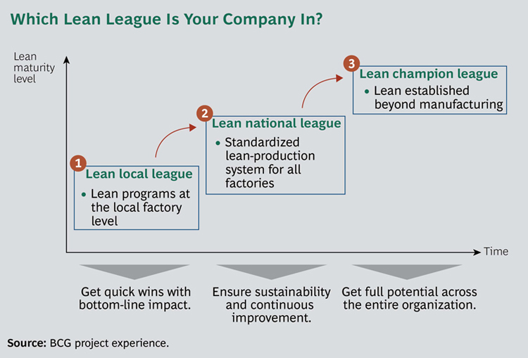 As in football, companies at different stages of lean development play in different leagues. Companies need to be honest with themselves about their current league status and which league they want to be in. (See the exhibit below.)