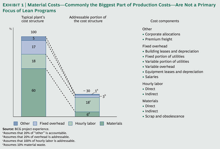 Many manufacturers that have applied lean concepts to their operations find that although they do achieve significant savings, their production costs remain high. This is, in most cases, attributable to material costs, which, depending on industry can range from 60 to 80 percent of total production costs. (See Exhibit 1.)