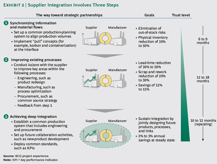 The best results have been achieved using a three-step integration process, which begins with optimizing the way information and materials flow between supplier and manufacturer. It extends to the way the supplier produces and can lead to collaborative product design and redesign. Ultimately, the process involves the full integration of a key supplier into a lean culture of continuous improvement. The main focus should be on enhancing supplier innovation and responsiveness—along with cost reduction over entire product life cycles—rather than on quick savings. Supplier integration has been achieved successfully by major consumer-product manufacturers, especially in the automobile industry. Toyota is one of the notable examples. (See Getting to Win-Win: How Toyota Creates and Sustains Best-Practice Supplier Relationships,(https://www.bcgperspectives.com/content/articles/automotive_metals_mining_getting_to_win_win_how_toyota_creates_and_sustains_best_practice_supplier_relationships/)BCG Focus, September 2007.) Before beginning the process, a manufacturer should analyze its own level of lean development and ambitions for the future. (See “The Three Leagues of Lean.”)