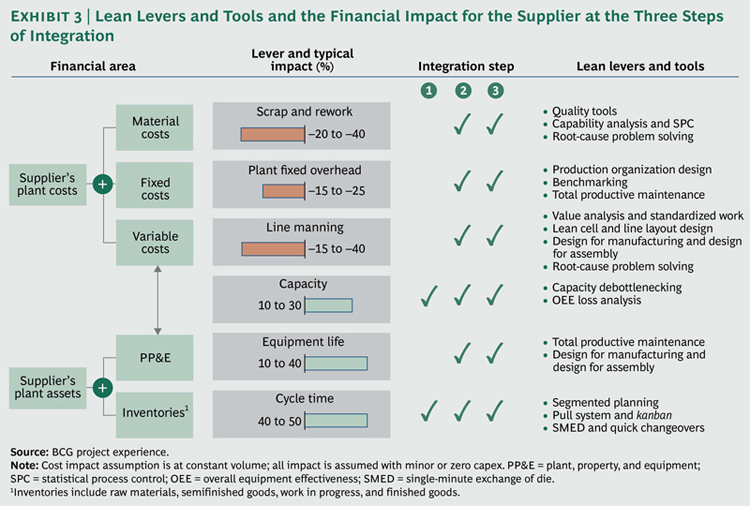 At each step in the process of integration, lean tools are used to activate value drivers and to create financial benefits for the supplier. (See Exhibit 3.)