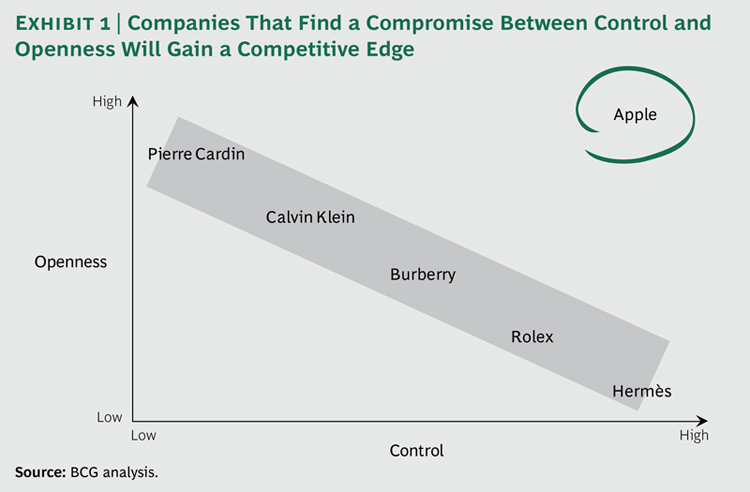 There is a powerful message here for CEOs in the luxury goods and services sector. By assembling such a powerful coalition, Apple did a very unusual thing: it established a balance between control and openness—two historically incompatible ways of managing a brand. (See Exhibit 1.) Apple had long been famous for its tightly controlled, or closed, business model. Yet the company had opened itself up to a host of partners, from giant telecom companies to independent contractors.