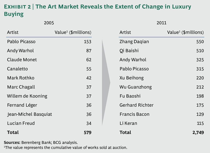 Concurrently, tastes in luxury are changing, especially among buyers from new markets. The art world, for instance, is undergoing a transformation, with new names quickly edging past the renowned artists who had been so sought after for much of the past century. (See Exhibit 2.)
