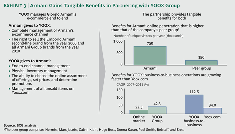 The good news is that a handful of leading luxury brands are seeing the value of an ecosystem approach, and they are beginning to experiment assertively as a result. For instance, high-end audio-equipment maker Bang & Olufsen has teamed with Lutron Electronics in an imaginative venture that creates alluring lighting and sound ambiences. Giorgio Armani and PPR now use the YOOX Group’s Yoox.com site to manage many of their Web-shopping sites. (See Exhibit 3.) And maison manager Richemont and Ralph Lauren have established a successful, long-term joint venture—in which each partner has an equal share—to design and create luxury watches priced at up to $27,000, as well as fine jewelry. The co-owned company designs, develops, manufactures, and distributes the products through Ralph Lauren boutiques and other high-end independent jewelry and luxury-watch retailers. It is Richemont’s first such joint venture with a luxury fashion designer and Ralph Lauren’s first foray into the precious-jewelry and luxury-watch businesses.
