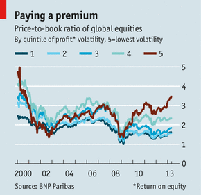 Orrin Sharp Pierson, a strategist at BNP Paribas, points to a huge preference among investors in recent years for “quality” stocks. He defines such stocks as those with the least volatile profits. As the chart shows, when the market was bottoming in late 2008 and early 2009 there was little difference in valuation between high-quality and low-quality companies. But the gap has widened steadily ever since. Quality stocks now trade at around 3.5 times their book (or asset) value.Of course fund managers are unlikely to tell clients they are investing in rubbish stocks. The quality label is highly flexible: not everyone defines it in the same way. Andrew Lapthorne, an analyst at Société Générale, identifies quality stocks as those that pass a series of financial tests known as the “Piotroski F-score”. On this measure, which includes things like cashflow and changes in leverage, Mr Lapthorne thinks quality stocks have generated a return double that of global equities since the dotcom bubble peaked in 2000.