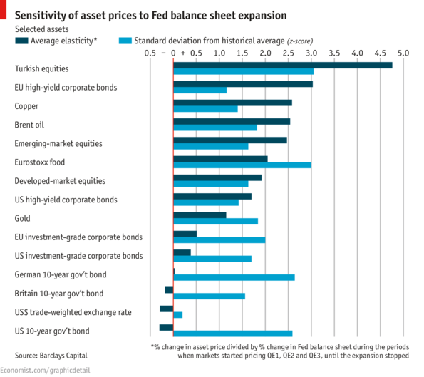 WITH short term interest rates at record lows, America’s Federal Reserve has sought to boost its economy by purchasing bonds with newly created money, thereby pushing down bond yields. In November 2008 the central bank announced it would buy up to $600 billion in agency mortgage-backed securities (MBS) and agency debt. The programme was extended in March 2009 by an additional $850 billion, and $300 billion in purchases of Treasury securities. This first episode of this so called quantitative easing, later known as QE1, was followed by two more rounds; QE2 in November 2010 ($600 billion) and QE3 in September last year ($40 billion of MBS and $45 billion of Treasuries each month). QE3, the Fed said, would continue until the outlook for jobs had improved substantially. America’s jobs market has improved, and markets are now reckoning the Fed will start to taper its bond purchases in coming months. According to EPFR Global, a data provider, this has put pressure on bond prices and investors have fled riskier assets; bond fund outflows reached a record in the week ending June 5th. Researchers at Barclays Capital have looked at which assets are most sensitive to the Fed’s balance sheet, by dividing the change in the asset prices over periods of QE, by the change in the size of the Fed’s balance sheet. At present, markets are adjusting to the Fed’s balance sheet merely expanding more slowly than expected. At some point they will have to adjust to its outright shrinkage. Since emerging-market equities and European and American high-yield bonds showed the greatest sensitivity to Fed balance sheet expansion, they could be expected to also fall most when it shrinks. Judged by how an asset deviated from its historical value during QE, Turkish equities and “defensive” stocks (those that do not move with the business cycle, like food) are most vulnerable.