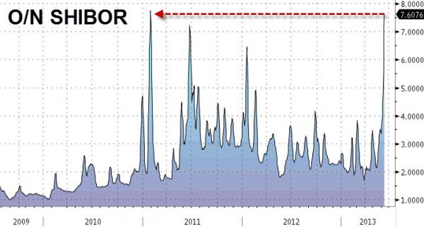Those who have been following our coverage of the bipolar Chinese liquidity situation (most recently here and here) are well aware of the unique position the world’s fastest (if only on paper) growing economy finds itself in: on one hand, it is the target of massive external hot money flows from both the Fed and the BOJ, which are pushing select inflation in the country higher, manifesting itself best in the real-estate market now higher for 12 consecutive months. On the other hand, the local banking system is in such dire need of liquidity, that not only have various short-term SHIBORs soared to multi-year highs but as Market News reported last week, China Everbright Bank failed to repay 6b yuan ($977m) borrowed from Industrial Bank on time yesterday because of tight liquidity, leading to “chain effect” borrowing in the market overnight and almost ushering in the first bank failure in China. The unprecedented liquidity shortage in China is seen best on the overnight SHIBOR chart below which just hit an all time high. In a nutshell there is zero free liquidity in the system. Which all culminated to last night’s surprising move by the PBOC to step aside from draining funds from the financial system for the first time in three months as even the PBOC now realizes that in the battle against Bernanke and Kuroda’s cash it is about to lose the fight.Bloomberg summarizes: