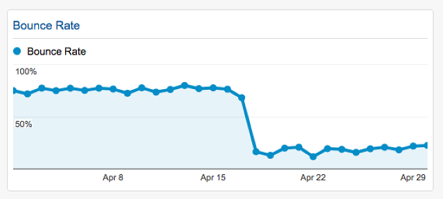 We prepared about a half-dozen of these stubs in draft, and scheduled them to go live the second week of April. As soon as we did, there were drastic, marked changes in our analytics. The first thing that caught my eye was a big drop in daily bounce rate: