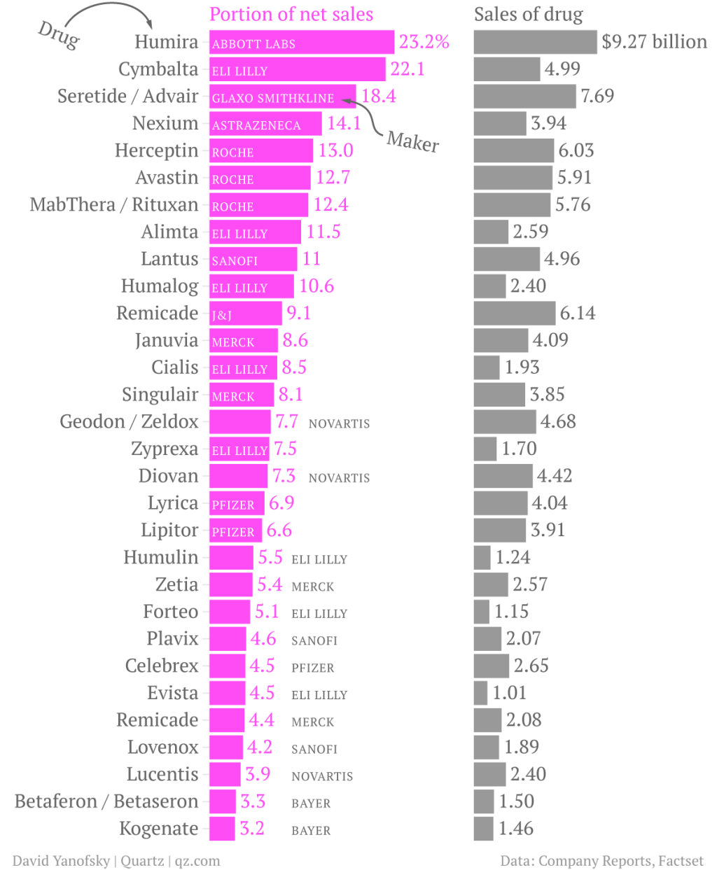 It is not uncommon for single drugs to account for a large share of a drug company’s business. Of the world’s 11 largest pharmaceutical companies in 2012, six had single drugs bring in more than 10% of total sales. Bayer was the only drug maker without a single treatment grossing more than 5% of total sales. Bayer’s business is also the most diverse of the lot. Where other top drug companies stick to pharmaceuticals and personal care, Bayer’s products encompass crop and materials science units. Ely Lilly was in US Federal Court yesterday (Aug. 19) to defend a patent on administering its lung-cancer therapy Alimta with certain vitamins to temper the prescription’s side effects. A victory for Lilly in the lawsuit could put off competition from generic drug makers until 2022, who would need to imitate the vitamin regimen to gain approval from regulators. (The chemistry of Alimta itself is covered by a different Ely Lilly patent which expires in 2017.) Patenting the way a drug is taken is taken is an unusual move, and a sign of how far drug companies will go to prolong their patents, though most analysts doubt it will succeed. Alimta purchases made up 11.5% of Ely Lilly’s net sales last year, making it the most important drug to the company after Cymbalta, an antidepressant, which accounts for 22.1%. Cymbalta’s patent expires in December. Cymbalta has the second largest portion of sales from any of the top 11 companies. The largest is Abbott Laboratories’ Humira, a rheumatoid arthritis treatment, which makes up 23.2% of Abbott’s sales. Humira’s $9.3 billion in sales last year exceeded those of any other drug on the market.