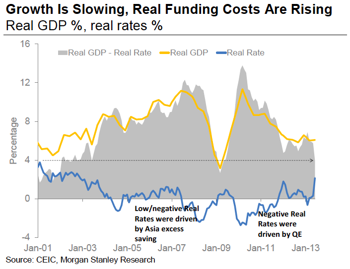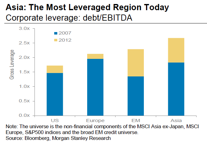 From Morgan Stanley, here are two charts that should have you a bit concerned about corporate debt in Asia. First, Corporate Asia is the most leveraged in the world. And second, growth is slowing, while real interest rates (borrowing costs) are rising. So between massive leverage, slowing growth and rising rates… there are some reasons to be concerned.