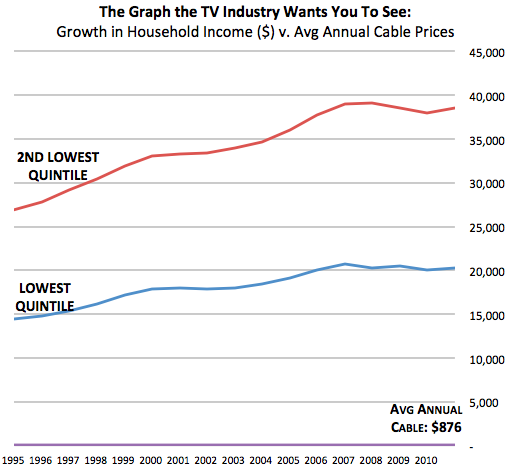 The answer is yes. Here’s the growth in TV costs vs. the growth in bottom 40 percent household income over the same time period as the graph above.
