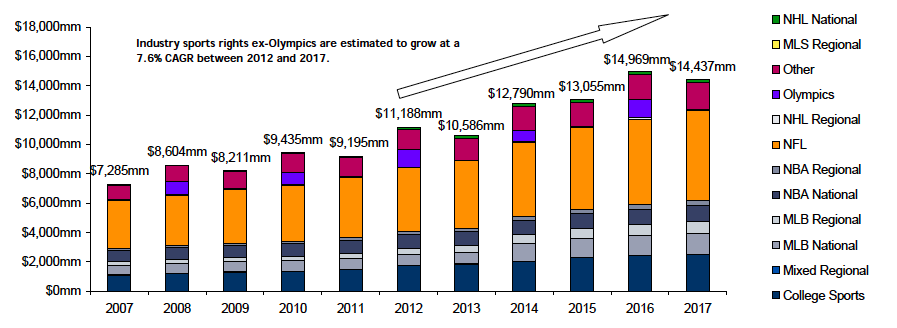 That’s a problem, because ESPN and other networks are selling a mass product, the cable bundle, whose price has tripled in the last decade and a half. And the number-one driver of rising cable costs today are the sports rights that make ESPN so valuable. The cost of exclusive rights to show sports are growing about 7% annually through the rest of the decade, 4X faster than private sector compensation growth (graph below via RBC/click to expand):