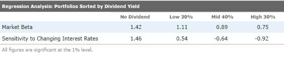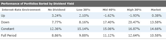 In a rising interest-rate environment, high-dividend-paying stocks have historically underperformed their lower-yielding and non-dividend-paying counterparts. The opposite is true when rates are falling or constant. In order to uncover that relationship, I looked at return data for non-dividend-paying stocks, dividend-paying stocks representing the 30% with the lowest yields, the middle 40%, and the 30% with the highest yields, from May 1953 through 2012. I ranked the monthly changes in the yield on the 10-year Treasury note and defined the quartile of months with the biggest jump in yields as periods of rising interest rates. The bottom quartile represents a falling-rate environment, while the middle 50% a constant rate environment. I then looked at how each of the four dividend portfolios would have performed in each of those three interest-rate environments. (This is not meant to illustrate an investment strategy, but rather how dividend-paying stocks tend to behave in different interest-rate environments). The table below shows the annualized returns for each portfolio.