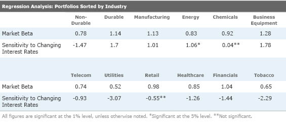 If this explanation is accurate, we should expect more defensive sectors to underperform in a rising-rate environment and outperform in a falling-rate environment. That’s exactly the pattern we find. I ran the same regression as described above on several industry groups from May 1953 through 2012. The table below illustrates the results.