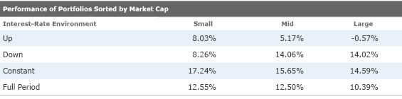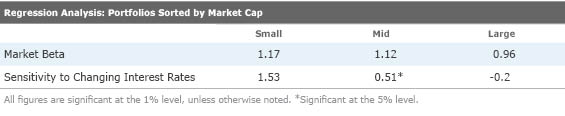 That might explain why small-cap stocks were historically less sensitive to changing interest rates than their large-cap counterparts. The table below illustrates how small-, mid-, and large-cap stocks performed during periods of rising, falling, and constant interest rates, assuming perfect timing of each of those environments. Small caps fared better than their larger peers when rates were rising but underperformed as rates fell. The results of the regression analysis support these findings and suggest that small-cap stocks even move in the same direction as interest rates, while rising rates tend to hurt large-cap stocks. That makes sense because small-cap stocks tend to be more highly leveraged to the fortunes of the domestic economy than their larger counterparts. Interest rates tend to rise as the economy strengthens, which probably disproportionately helps small caps. They are also less well positioned to weather recessions than larger-cap stocks, which may explain why they tend to underperform as rates fall.