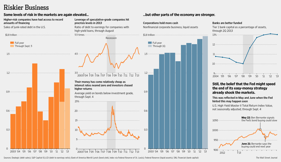 Many investment-grade corporate borrowers have locked in rates. But companies with credit ratings below investment grade had $2 trillion of junk bonds and leveraged loans outstanding in July, up from $1.3 trillion in 2008, according to S&P Capital IQ LCD. Many of those bonds will need to be refinanced, while the cost of the floating-rate loans will rise along with interest rates.