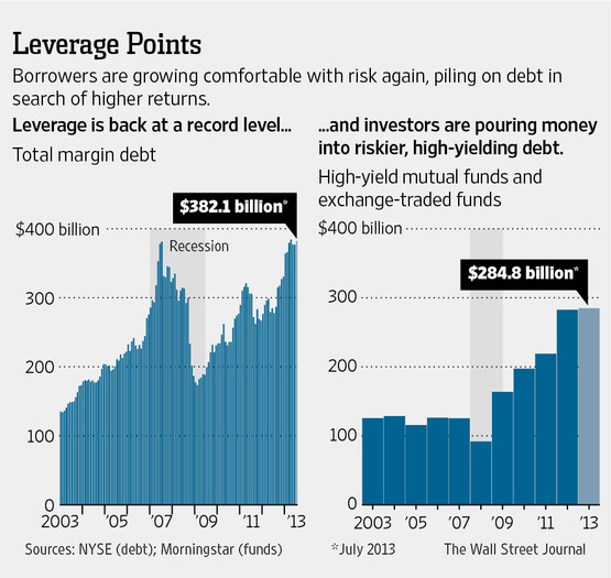 Many people are chasing higher returns with margin loans that use investment portfolios as collateral. Margin debt reached a record $384 billion earlier this year, up 29% from 2012 and slightly more than the previous high set in 2008.