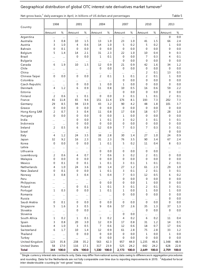 The triennial central bank survey of foreign exchange and derivatives market activity from the BIS is out. FX details are here and OTC IR derivatives are here. Oh, and the Bank of England’s parochial summary is here. But if you are interested in how financial centres stack up against each other you’ll need to consult this table: London accounted for almost 41 per cent of global FX turnover at the survey point (April this year). That compares with 19 per cent for the US and 5.7 per cent for Singapore, the third largest financial centre as far as FX goes. London’s dominance is even more extreme when it comes to IR derivatives.