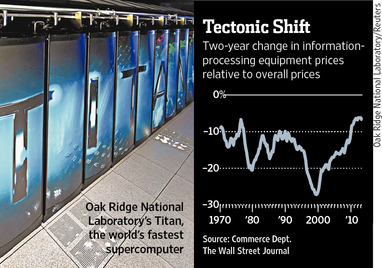 The government quality-adjusts its price figures, so if a company is buying, say, a more advanced server for the same price it paid for a less powerful one five years ago, that registers as a price decline. So the slower rate of price deflation in recent years suggests that technology isn’t becoming obsolete as fast as it used to. The implication is that the pace of innovation is slowing.