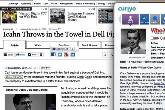 When activist investor Carl Icahn gave up his quest to block a buyout of computer maker Dell this week, he compared the attitude of the company’s board with 1930s movie idol Clark Gable’s most famous line: “Frankly, my dear, I don’t give a damn.” What if you were reading this news online and didn’t know who Clark Gable was? You could look him up in a source like Wikipedia, but that would mean leaving the page where the Icahn story was, and possibly never returning to learn more about the story.If you had a new Web browser add-on called Curiyo, you could simply click on his name and learn about Mr. Gable from Wikipedia or other sources in a pop-up box—never leaving the page or the story.