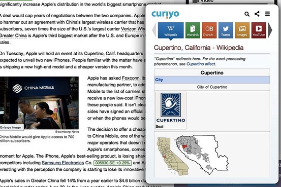 Curiyo is an add-on to all major web browsers that lets you look up names, places and other terms in a pop-up window without leaving the page you’re reading. Walt Mossberg tells us that, despite a few downsides, it is very effective