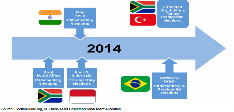 On top of the economic imbalances highlighted above, some EM countries risk paralysis in the coming quarter due to political events. Governments that seek to be re-elected will want to avoid policy tightening, increasing the risk of a market attack.