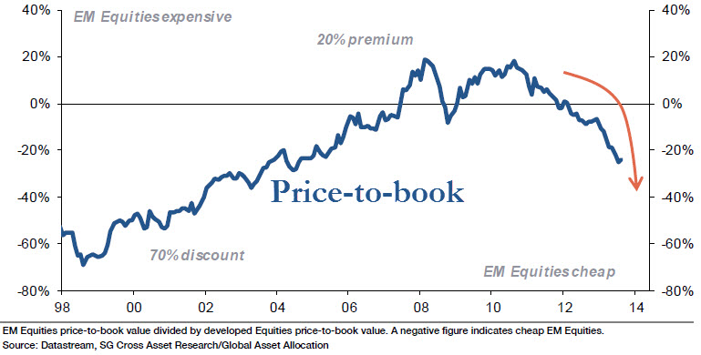 EM equities started to correct in 2010, when they traded at a premium of around 20% relative to developed markets (as measured by the price to book value ratio).