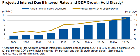 Fitch notes that credit to GDP will have risen by around 87 percentage points in the five years ending in 2013, nearly twice the pace in other countries prior to the financial crisis.