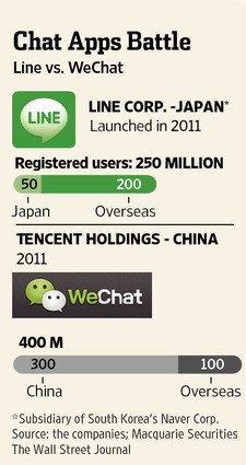 Line and WeChat are also competing against fast-growing Asian messaging apps such as South Korea’s Kakao Talk, which has about 110 million users.