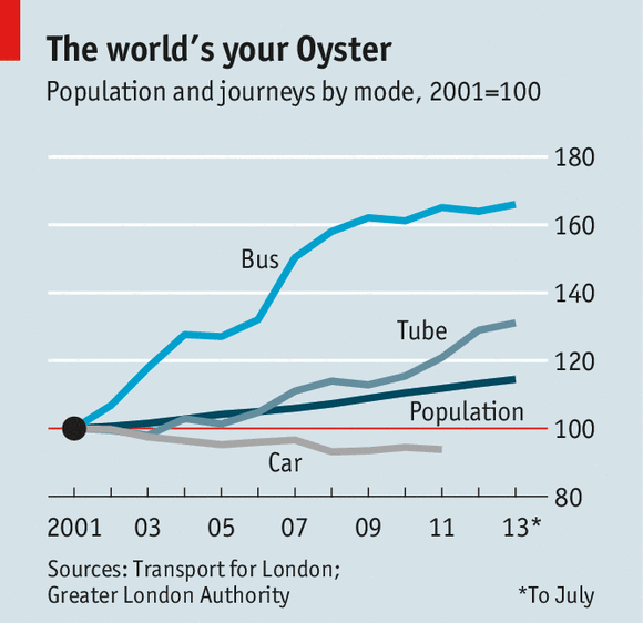 FROM his offices high above Victoria station, Glenn Keelan, an engineer, looks down on a hive of activity. Huge diggers chew up and spit out earth just outside the 19th-century façade of the original station. Nearby, workers are lowered in boxy metal cages to work on an emergency entrance. By the time the extension is finished in 2018, the Tube station will be three times bigger. It needs to be: Victoria now has more people going through it than Heathrow airport, and its traffic has increased more quickly over the past four years.Whereas the number of people driving in London is falling, Tube and bus use is surging (see chart). Each day 3.7m people use the Underground while 6.4m take a bus. Once-quiet routes are crammed. The London Overground, a rebranded and improved railway line, carries 120m passengers a year, up from just 33m in 2008. The Docklands Light Railway carried 66m passengers in 2008. It now carries 100m.