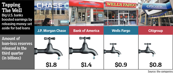 Federal regulators have warned banks to be careful about padding their profits with money set aside to cover bad loans. But some of the nation’s biggest banks did more of it in the third quarter than earlier this year. J.P. Morgan Chase JPM +0.55% & Co.,Wells Fargo WFC +0.40% & Co., Bank of America Corp. BAC +0.64% and CitigroupInc., C -0.18% the nation’s largest banks by assets, tapped a total of $4.9 billion in loan-loss reserves in the third quarter, up by about a third from both the second quarter and the year-ago quarter after adjustments. All the banks except Citigroup showed significant increases compared with the second quarter. Read more of this post