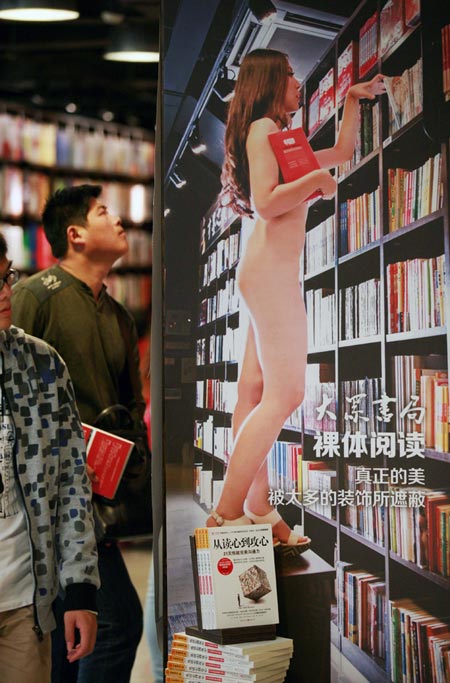A nude model searches for a book on a high shelf in this promotional poster for the store. (Photo/CFP) A large cardboard cut-out at the Nanjing store. (Photo/CFP)