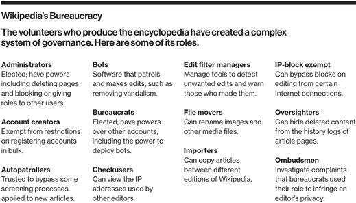 When asked to identify Wikipedia’s real problem, Moran cites the bureaucratic culture that has formed around the rules and guidelines on contributing, which have become labyrinthine over the years. The page explaining a policy called Neutral Point of View, one of “five pillars” fundamental to Wikipedia, is almost 5,000 words long. “That is the real barrier: policy creep,” he says. But whatever role that plays in Wikipedia’s travails, any effort to prune its bureaucracy is hard to imagine. It would have to be led by Wikipedians, and the most active volunteers have come to rely on bureaucratic incantations. Citing “WP:NPV” (the neutral point of view policy) or threatening to take a matter toARBCOM (the arbitration committee for dispute resolution) in a way that suggests you know a lot about such arcana is easier than having a more substantive discussion.