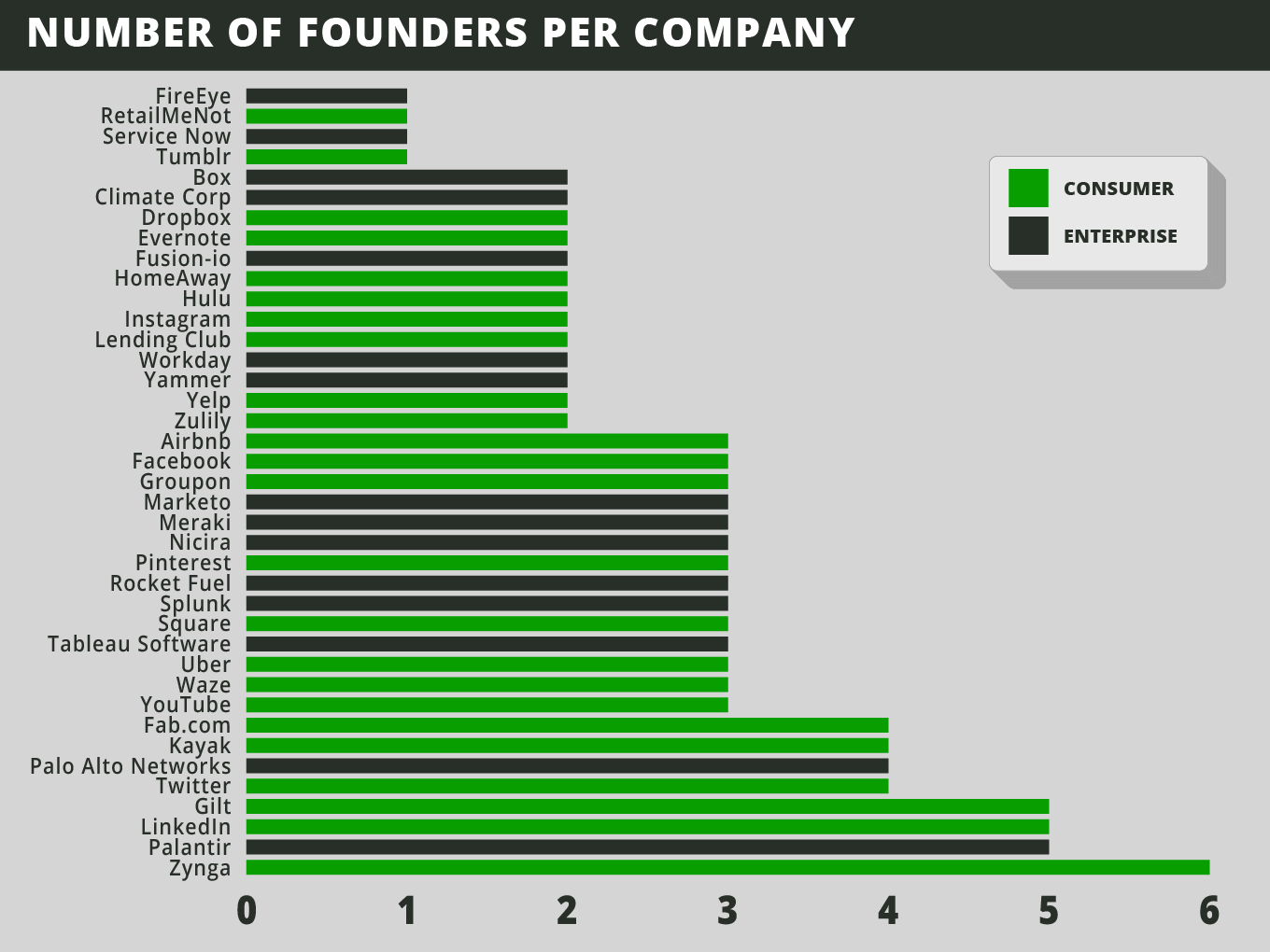 That said, the four unicorns with sole founders (ServiceNow, FireEye, RetailMeNot, Tumblr — half enterprise, half consumer) have all had liquidity events and are worth more on average than companies with co-founders.